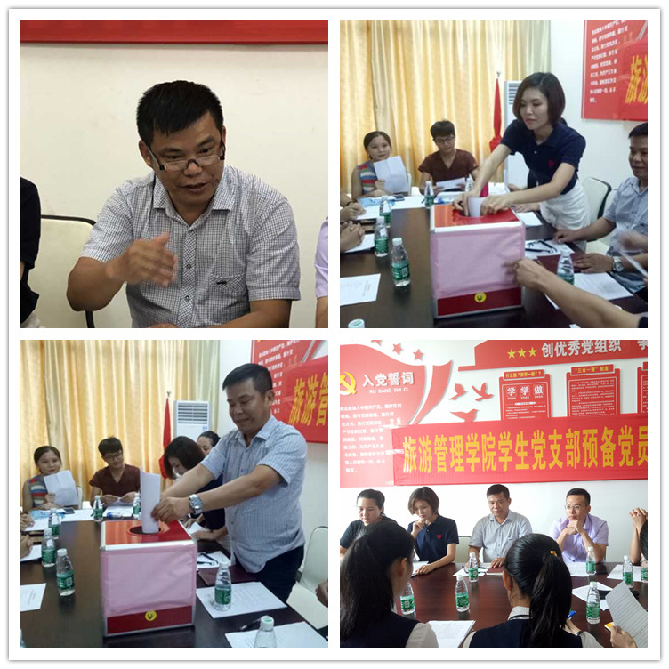 为响应党的号召,培养优秀党员。2019年5月27日15:00, 旅游管理公司员工党支部在党员之家2-309召开了预备党员转正大会,出席本次会议有旅游管理公司党总支符胜书记,员工党支部书记刘萍男老师,员工党支部纪检委员郑伟老师,员工党支部樊靖老师,正式党员徐维同志,赵志山同志。