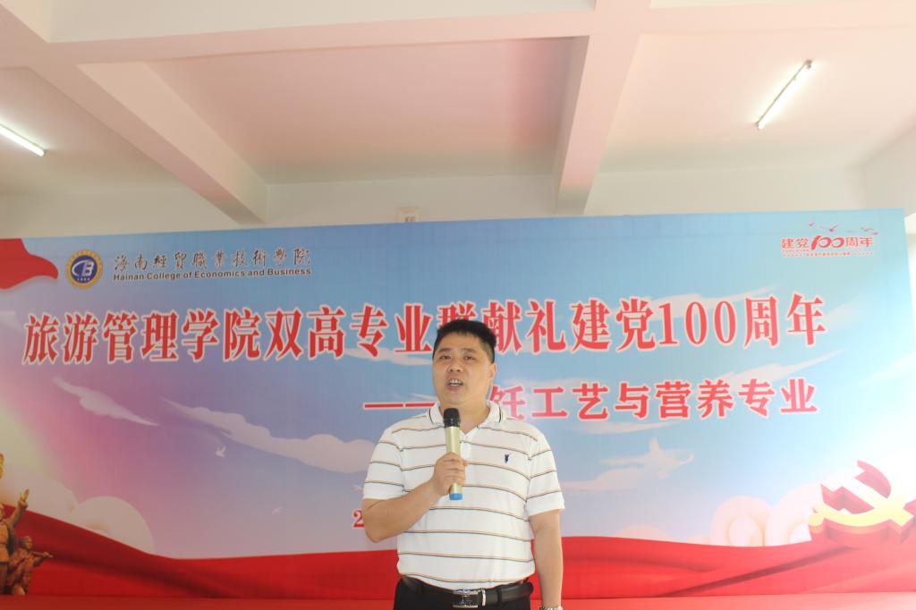 为庆祝中国共产党建党100周年,旅游管理公司于4月23日中午在二栋教学楼架空层,隆重举办旅游管理公司双高专业群烹饪工艺与营养专业献礼建党100周年活动。公司经理吉家文、党总支书记符胜、副经理范洪军、党总支副书记刘萍男以及全体教职工出席本次活动。