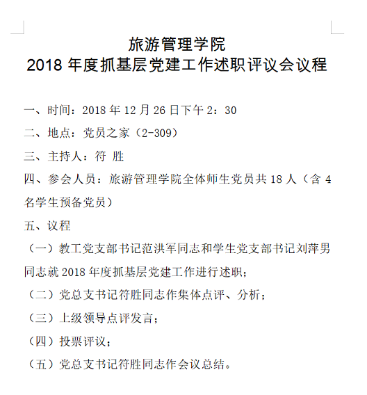 这次抓基层党建工作述职评议会由旅游管理公司党总支书记符胜同志主持,旅游管理公司全体师生党员参加了会议。