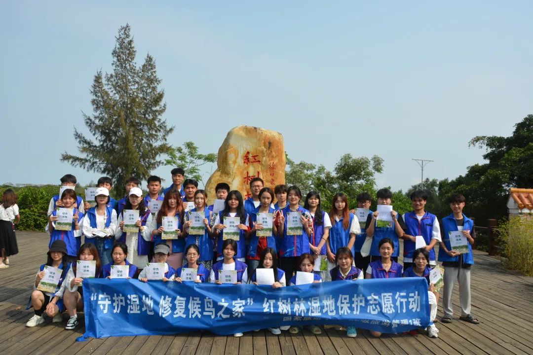 2023年3月12日,第45个植树节来临之际,在东寨港红树林保护区,22级旅游管理1班团支部的志愿者团队正在开展一项重要的任务——红树林保护区环保宣传与清洁活动。