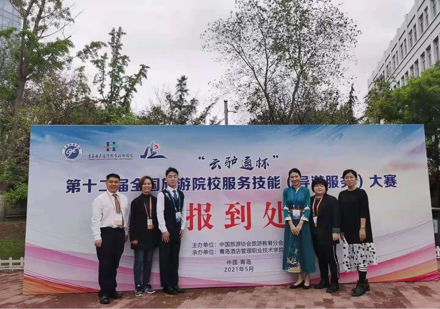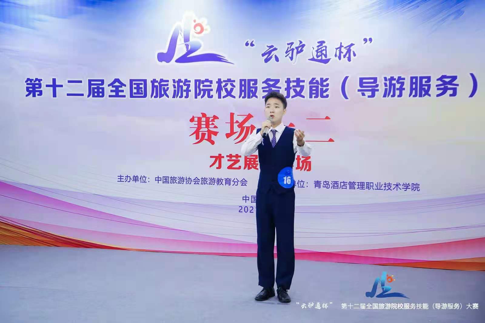 全国旅游院校服务技能(导游服务)大赛是由中国旅游协会旅游教育分会发起组织的全国性、行业性的大型赛事。此次大赛由中国旅游协会指导、中国旅游协会旅游教育分会主办、青岛酒店管理职业技术公司承办,设置了普通话导游服务(高等院校组、中职公司组)和英语导游服务(高等院校组)两个赛项,分别包括理论考核、导游讲解(现场)和才艺展示三个环节。