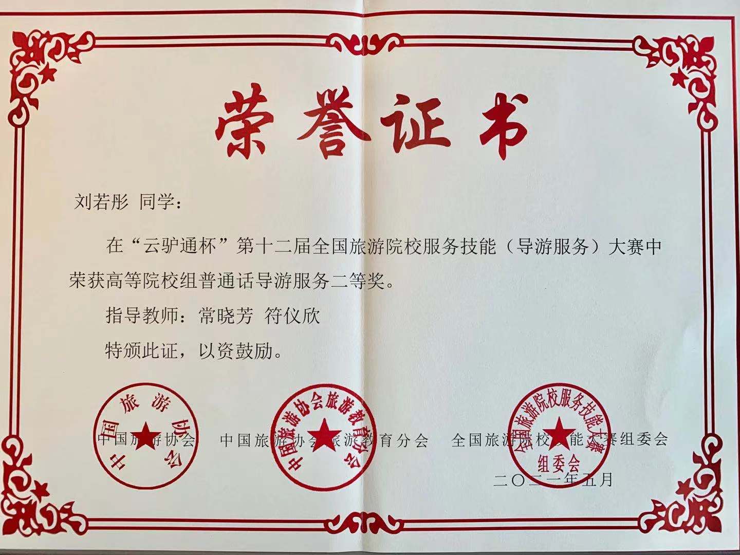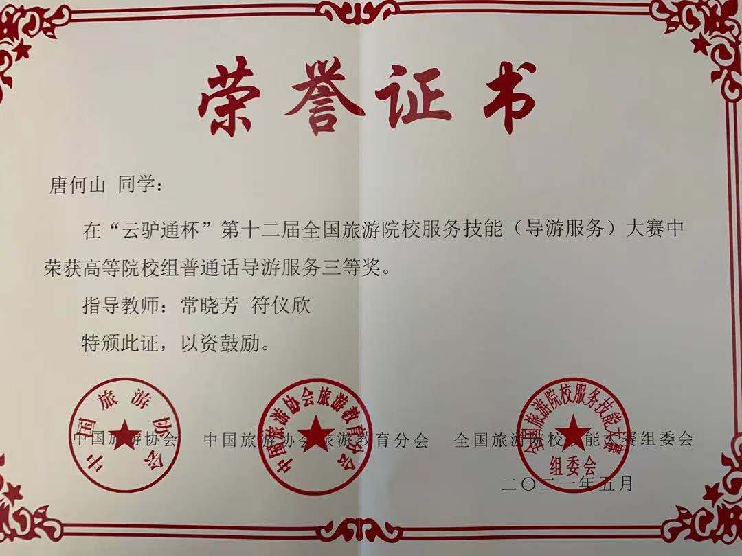 在这场文化与艺术的交流盛宴中,公司的两位参赛选手刘若彤和唐何山同学在赛场上向评委们展示了bevictor1946韦德官网学子的风采。经过三天的激烈角逐,刘若彤同学荣获“云驴通杯”第十二届全国旅游院校服务技能(导游服务)大赛高等院校组普通话导游服务二等奖;唐何山同学荣获三等奖。