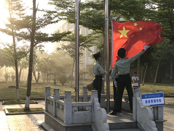 (旅游管理公司宣传部林晶报道)2018年4月2号上午7点20分,公司于经贸广场举行了“家是经贸,国是中国”为主题的本学期第二次升旗仪式。出席本次仪式的有公司学工办主任刘萍男老师、17级辅导员符珍老师、辅导员郑伟老师、实习辅导员赖柯伽老师以及旅院全体员工。