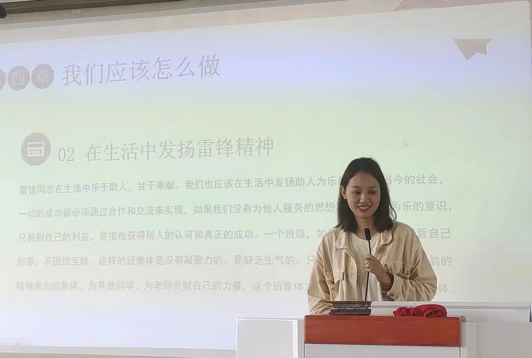 李越从“你对雷锋认识多少”、“同学们的见解”、“生活中存在的雷锋”、“我们应该怎么做”、“对学雷锋的总结”五个方面开展讲解,她通过引用详实的历史资料,以生动平实的语言,从多角度呈现了一个真实、平凡、伟大、美好、永恒的雷锋,诠释了雷锋同志全心全意为人民服务的精神,并希望大家能够认真贯彻落实习近平总书记关于深入开展学雷锋活动的重要指示精神,持续推动学雷锋活动融入日常、化作经常,让雷锋精神在新时代绽放更加璀璨的光芒。