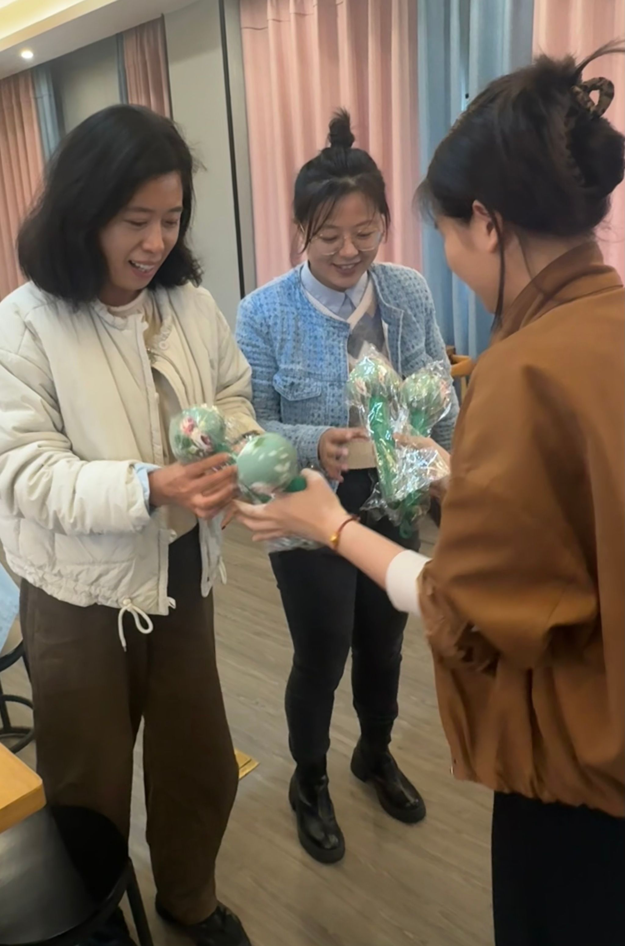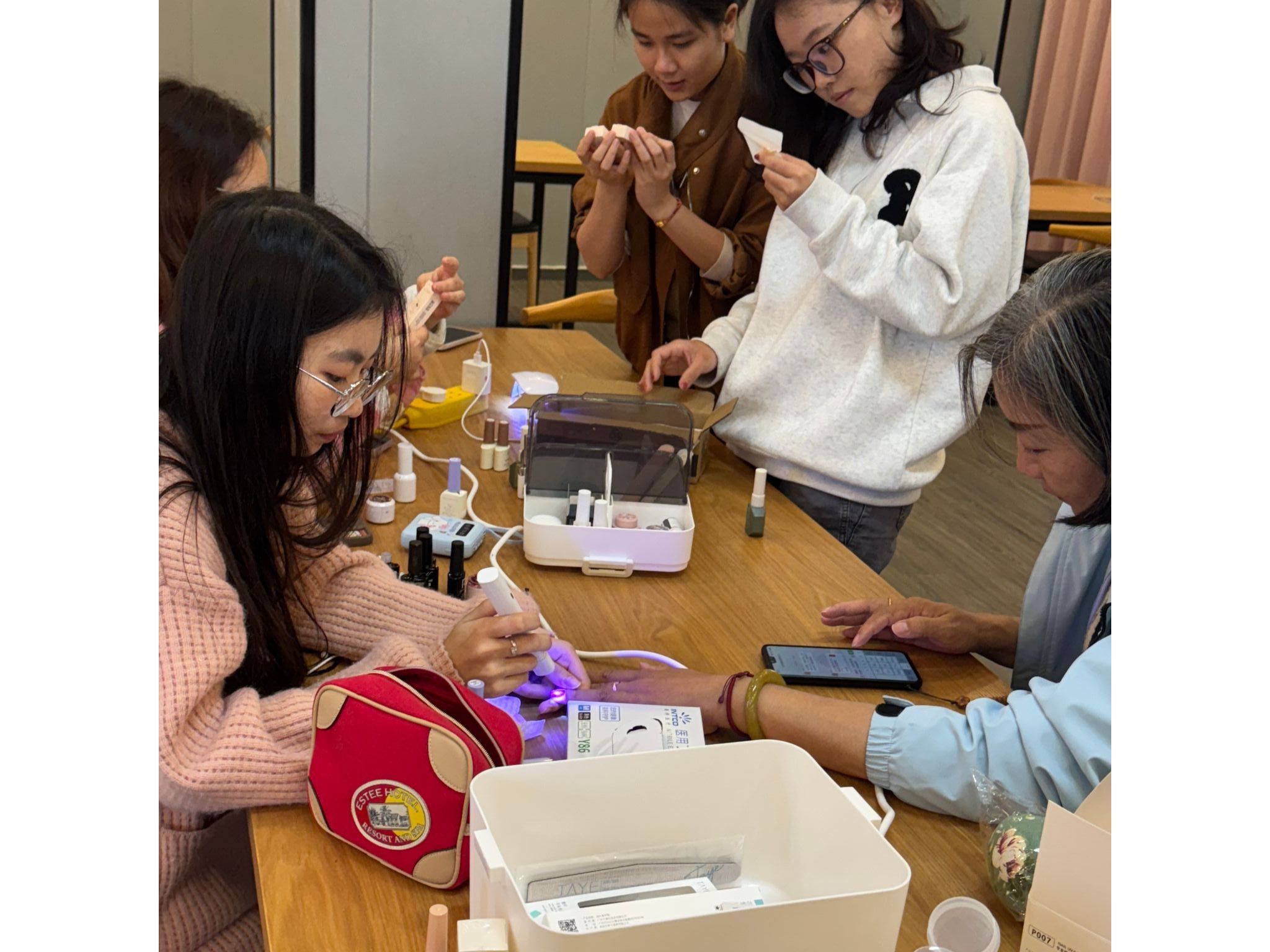 上午,几位员工志愿者们已经就位,为女教师们提供美甲服务,致敬她们的辛勤付出。女教师到场后先修剪甲型,清除死皮倒刺,随后再抛光甲面、涂上底油就开始上色。大家各自挑选了自己喜爱的颜色和样式,耐心地等待上色。在美甲的间隙,教师们不仅学习到了指甲护理的技巧,还交流了工作生活的点滴和自己的兴趣爱好,彼此间的距离也拉近了许多。美甲结束后,志愿者们还给女教师们赠送了养生“开心锤锤”,现场充满了欢声笑语,洋溢着节日的喜悦。