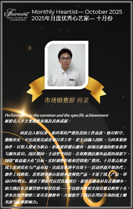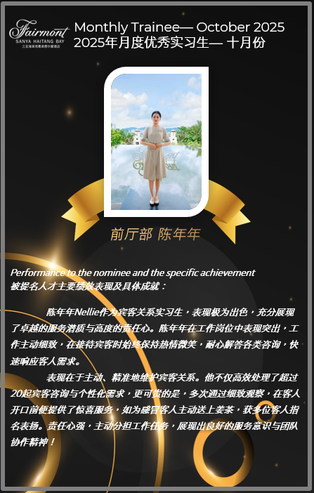 陈年年和何星同学荣获三亚海棠湾熹棠费尔蒙酒店2025年10月份优秀实习生称号
