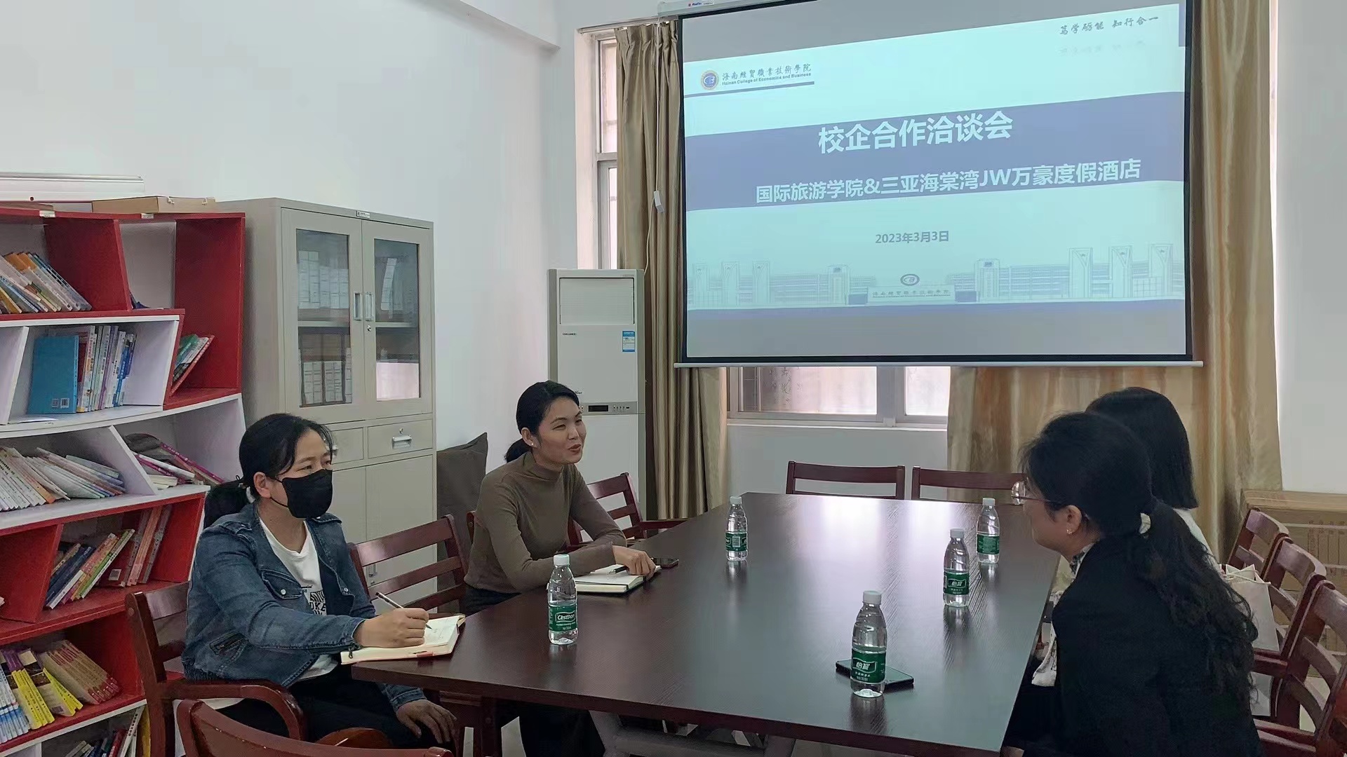 2023年3月7日,海口万豪酒店韩晓人力资源总监来访公司,公司党总支书记孙金、党总支副书记刘萍男、张一兵老师热情接待。双方就双高建设院校在探索校企合作办学体制机制、工学结合人才培养模式、增强社会服务能力、跨区域共享优质教育资源等共同关注的热点话题进行了合作探讨,初步拟定了万豪集团“梦想家”主管培育实习就业培训计划。