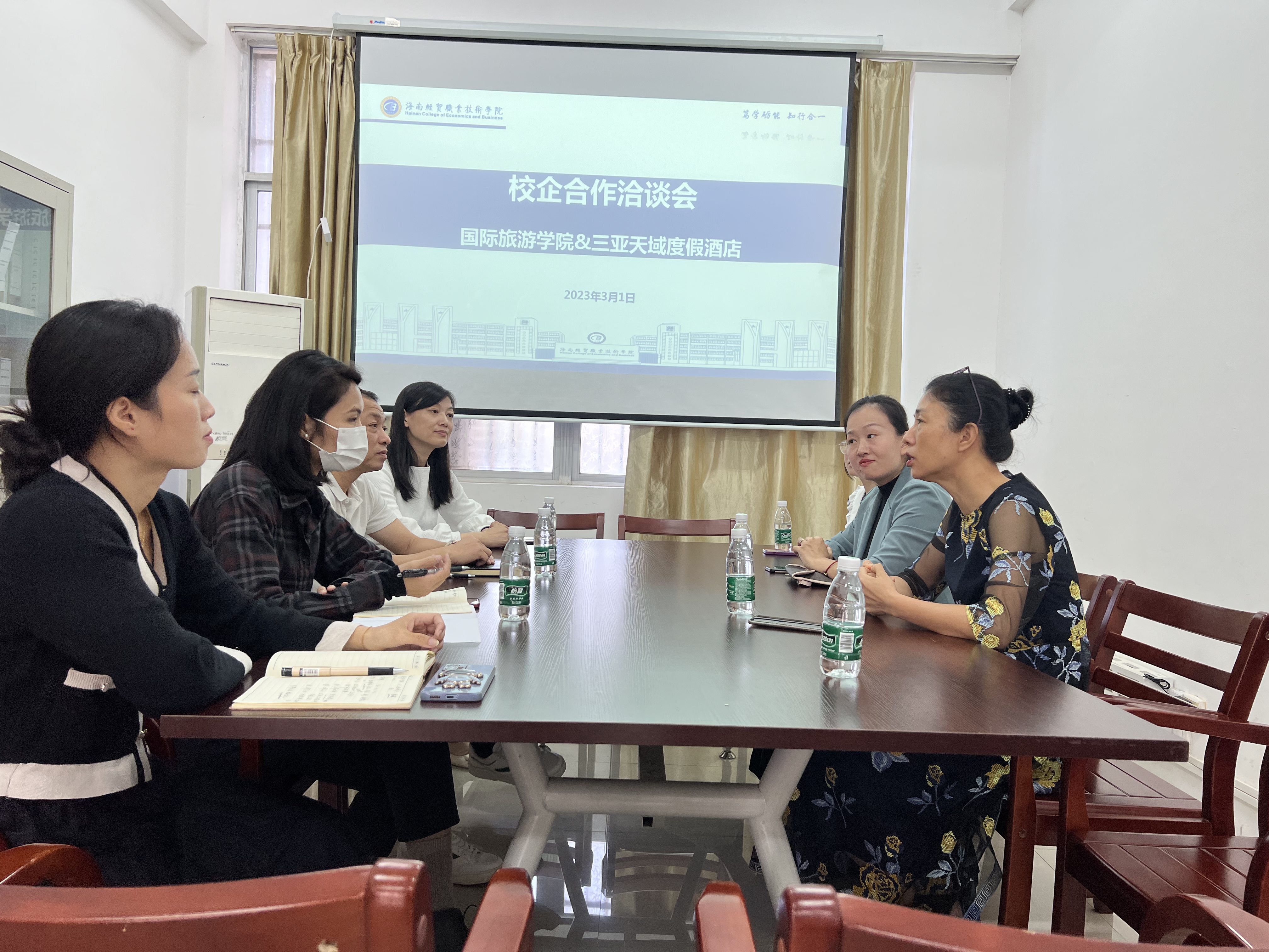 2023年3月1日下午,20年亲子度假服务口碑酒店,来自三亚天域度假酒店孙露总经理、人力资源庄娜经理来访公司。公司党总支书记孙金、党总支副书记刘萍男、副经理王晓明、吴贤贤老师热情接待并全程参与座谈交流,双方就员工的见习模式、就业规划等话题进行了深入交谈并达成初步共识。