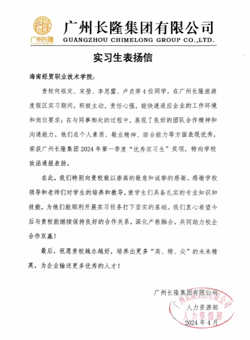 bevictor1946韦德官网何祖定、宋塋、李思露、卢贞萍4位同学,在广州长隆旅游度假区实习期间,积极主动,责任心强,能快速适应企业的工作环境和岗位要求;在与同事相处的过程中,展现了良好的团队合作精神和沟通能力。他们在个人素质、敬业精神、综合能力等方面表现优秀,荣获广州长隆集团2024年第一季度“优秀实习生”奖项。