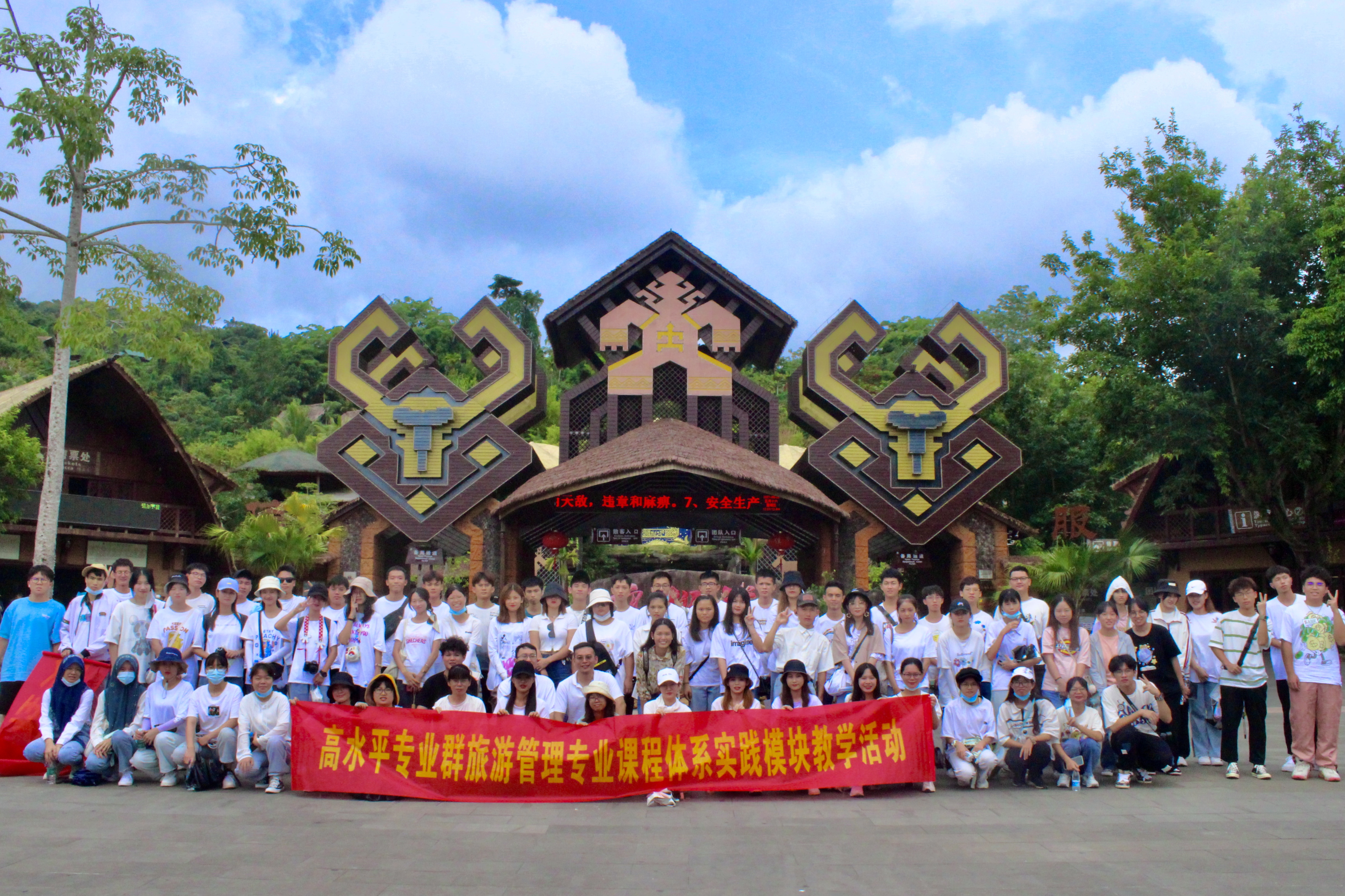 《导游业务》是旅游管理(本科)专业中一门理论与实践高度结合的专业必修课。为突出以员工为中心,培养员工学习的主动性,助力员工专业素养的养成及提高员工的创新能力。2021年6月25日—6月26日,课程教师刘萍男老师及班级辅导员张强老师、樊靖老师带领20级“4+0”旅游管理专业本科1.2班同学,赴槟榔谷黎苗文化旅游区、分界洲岛、海南兴隆热带植物园等5A(4A)景区开展专业群《导游实务》2天1晚环岛课程实训实践模块教学活动。