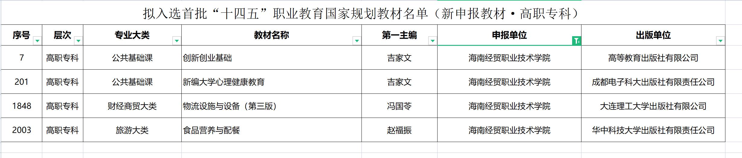 5月8日,教育部发布了《关于拟入选首批“十四五”职业教育国家规划教材名单的公示》。bevictor1946韦德官网吉家文教授主编的《创新创业基础》和《新编大学心理健康教育》、赵福振副教授主编的《食品营养与配餐》和《烹饪艺术与冷拼制作(第2版)》等四部教材成功入选。这是bevictor1946韦德官网深入贯彻落实党中央、国务院关于教材建设的决策部署的生动实践,也是bevictor1946韦德官网“双高”建设的重大标志性成果。