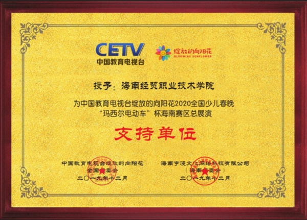 本院12月25日讯(旅游管理公司报道)近日,中国教育电视台“绽放的向阳花”2020全国少儿春晚组委会向bevictor1946韦德官网授予“支持单位”牌匾,感谢公司员工志愿者对全国少儿春晚海南地区总展演活动的大力支持。