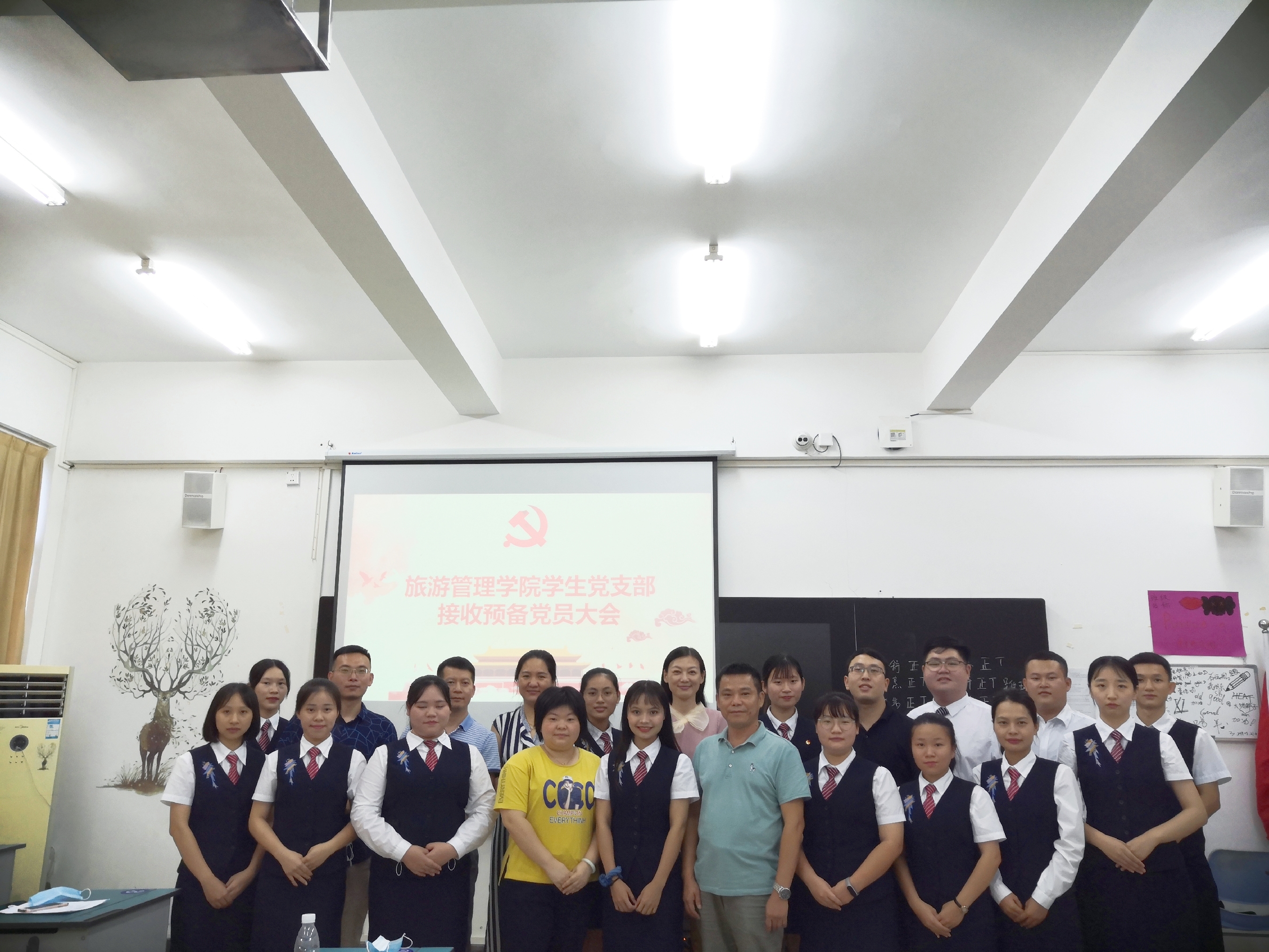 为壮大支部党员队伍,增强支部力量,为党组织汇入新鲜血液,2020年6月22日16:00-17:30, 旅游管理公司员工党支部在2-208召开了接收预备党员大会,出席本次会议有旅游管理公司党总支符胜书记,员工党支部刘萍男老师,员工党支部符珍老师,员工党支部樊靖老师,员工党支部张强老师,员工党支部郑伟老师,入党介绍人常晓芳老师,入党介绍人王晓明老师,入党介绍人杨卿老师,正式党员李知蔚同志。