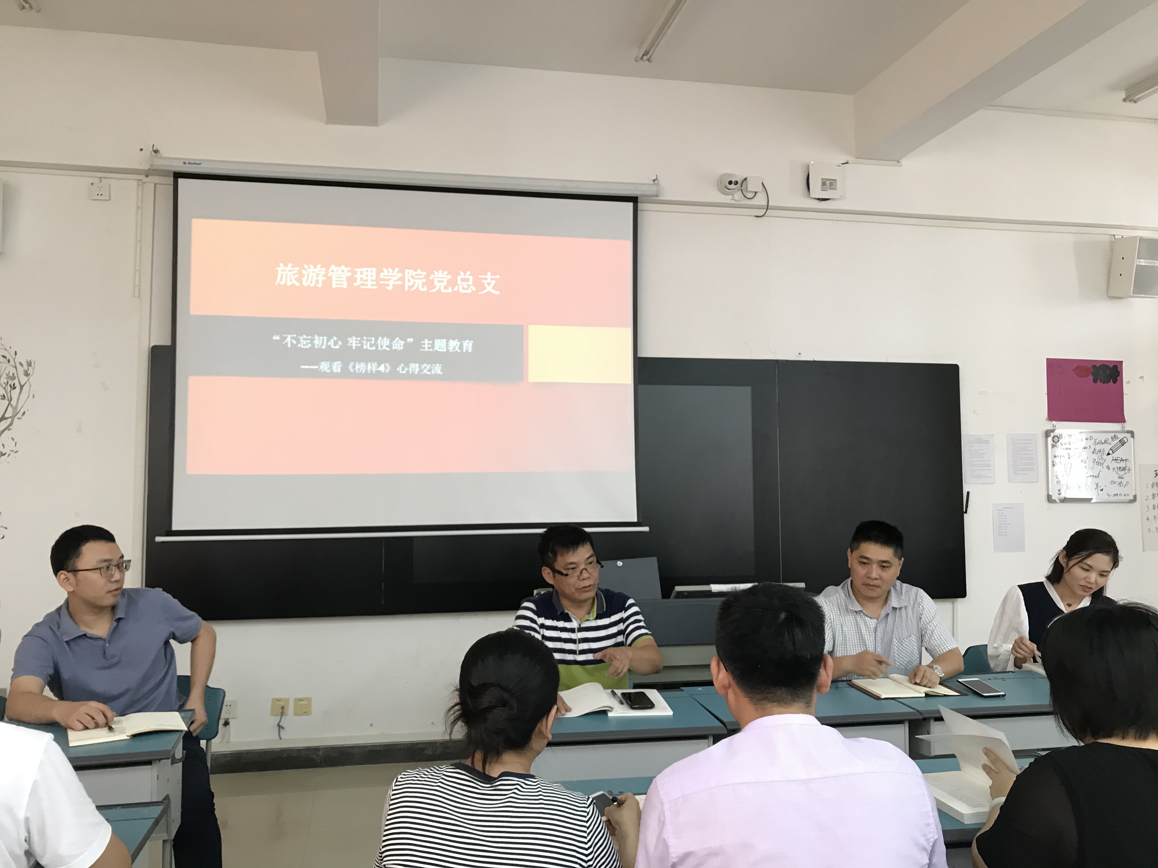 (旅游管理公司报道)为深入开展“不忘初心、牢记使命”主题教育,确保主题教育取得扎实成效,2019年10月22日公司党总支组织全体师生党员在第二教学楼2-208观看完《榜样4》视频,随即召开主题教育专题节目《榜样4》观后座谈交流会。会议由党总支书记符胜主持。