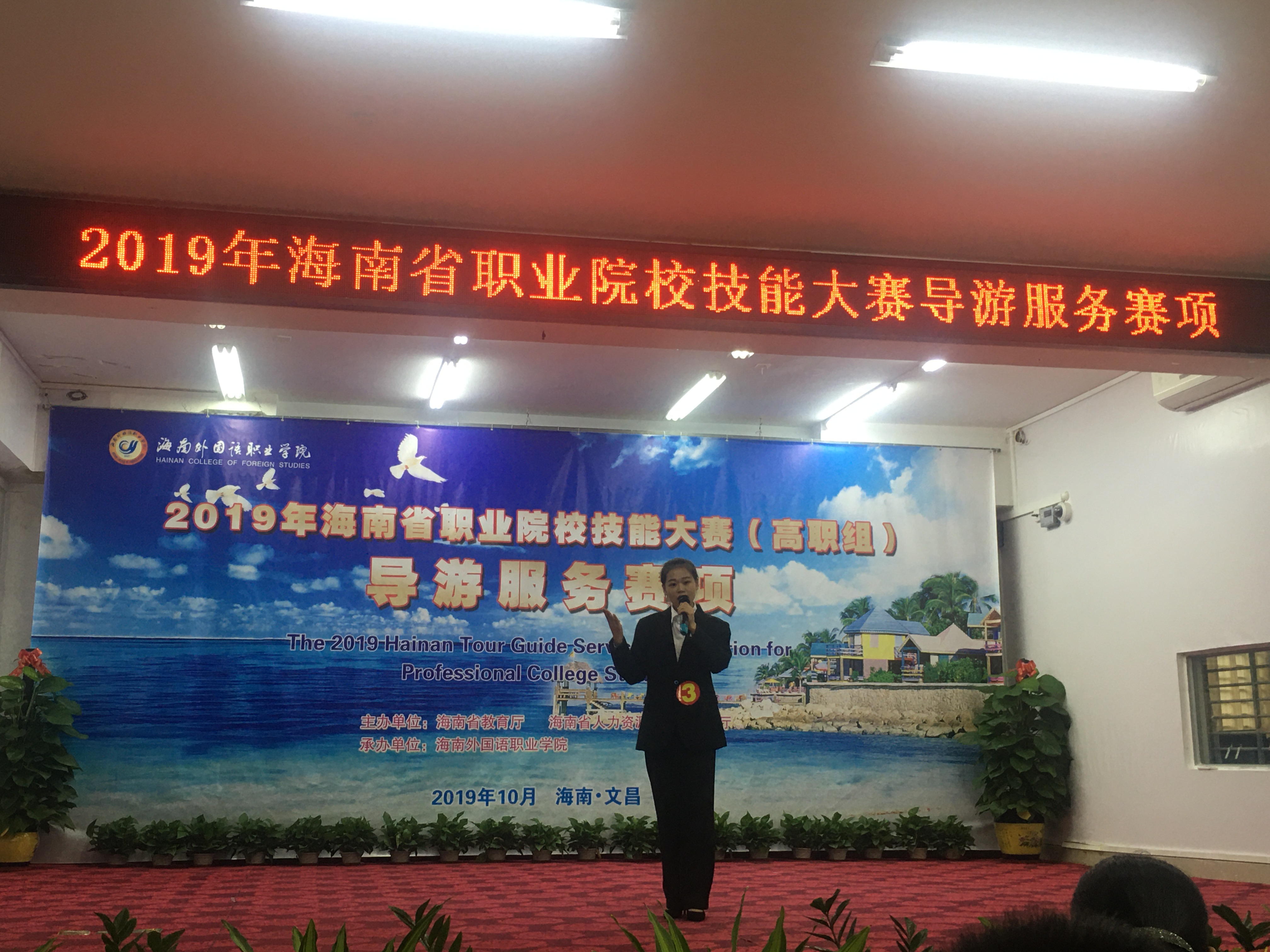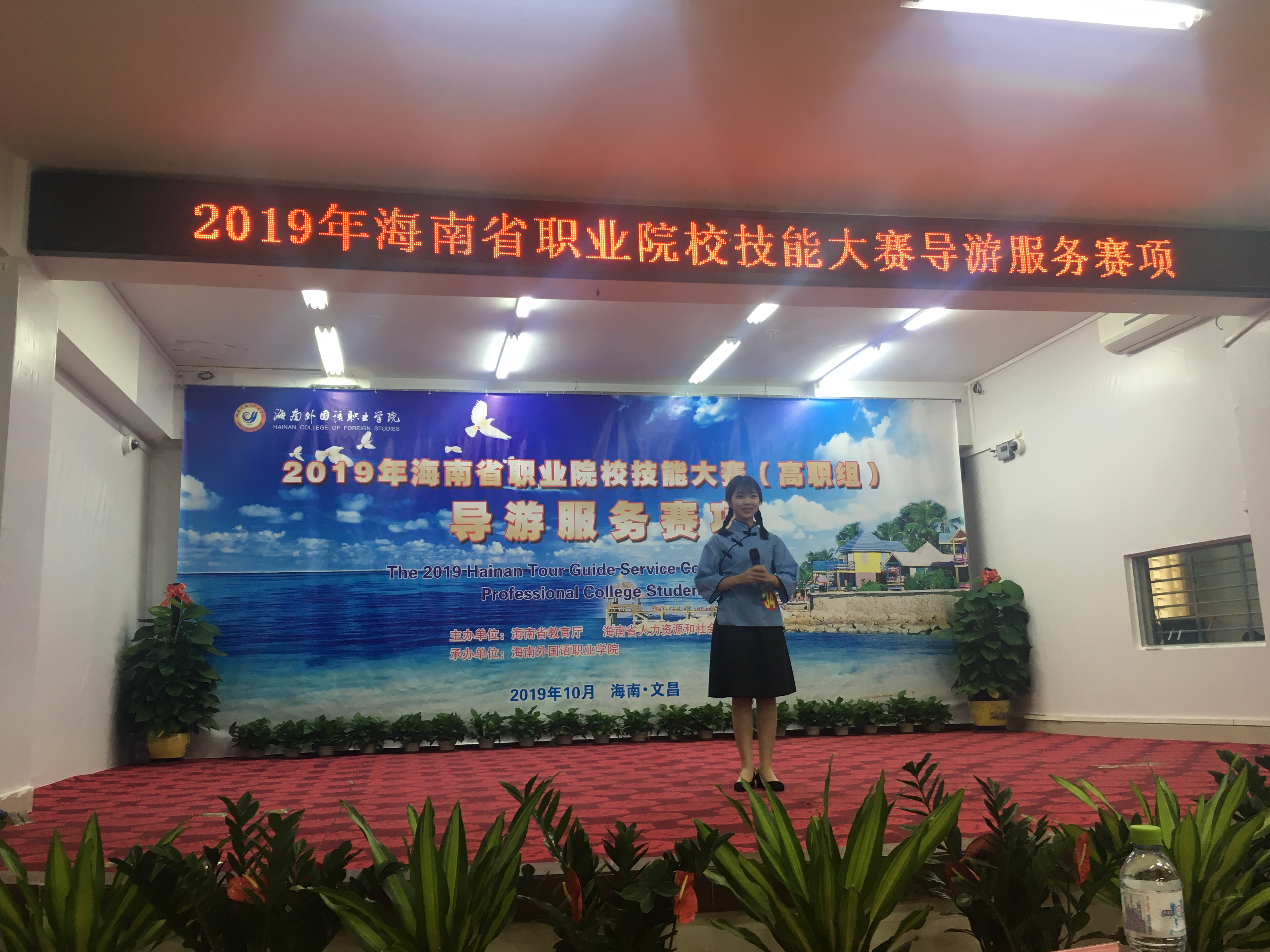2019年10月30日下午,由海南省教育厅、海南省人力资源和社会保障厅主办,海南外国语职业公司承办的2019年海南省职业院校导游服务技能大赛(高职组)顺利落下帷幕。来自全省11个院校的35位选手参加了本次大赛。公司旅游管理公司选派18旅游管理专业2班的张喜丽、黄凤同学参赛。经过激烈的角逐,分别获得了二等奖、三等奖的好成绩。