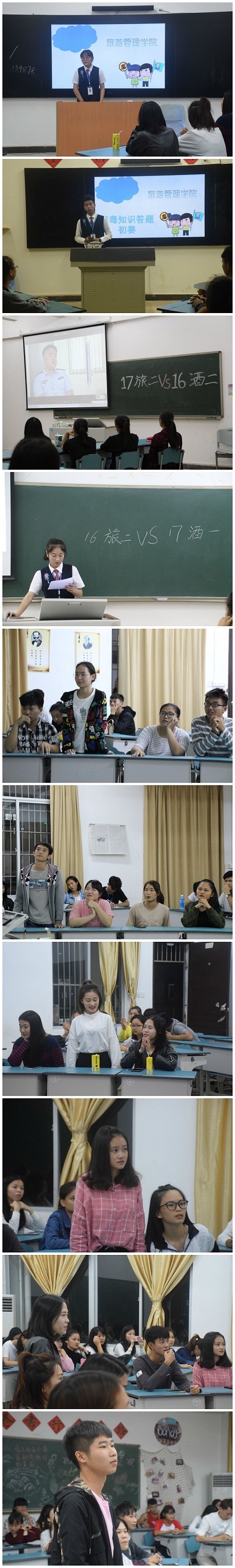 (旅游管理公司宣传部梁健报道)为了让公司员工全面了解毒品的危害,进一步增强公司员工拒毒、防毒的意识和能力,有效培养健康的生活情趣和社会责任感,确保员工身心健康发展。公司于2017年10月31号在二栋教学楼开展青春建功十九大 不忘初心跟党走”主题系列活动之“员工不吸毒,校园无毒品”禁毒知识竞赛活动。出席此次禁毒知识竞赛的有16级、17级全体员工。