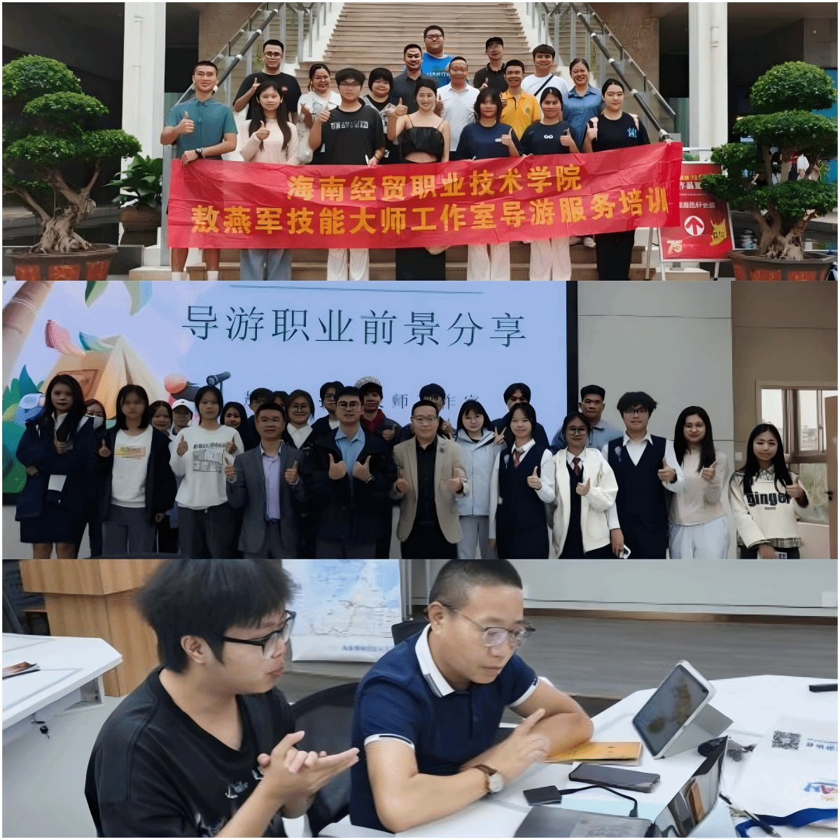 充分发挥社会服务职能,多维赋能海南旅游发展。协助承办琼北区域导游大赛,完成海口市导游年度培训8000余人次;敖燕军、李飞等受邀开展省旅文厅相关培训、专题讲座,覆盖3200余人次,还为中国国际旅游交易博览会接待组提供培训与讲解词编写服务;工作室成员斩获研学指导师技能大赛、东坡主题线路设计比赛一等奖,敖燕军担任多项行业赛事评委及旅游线路设计评审专家;完成兴隆旅游管委会展馆导游词编写、中国旅游集团展厅讲解员培训等技术支持,为行业发展注入专业力量。
